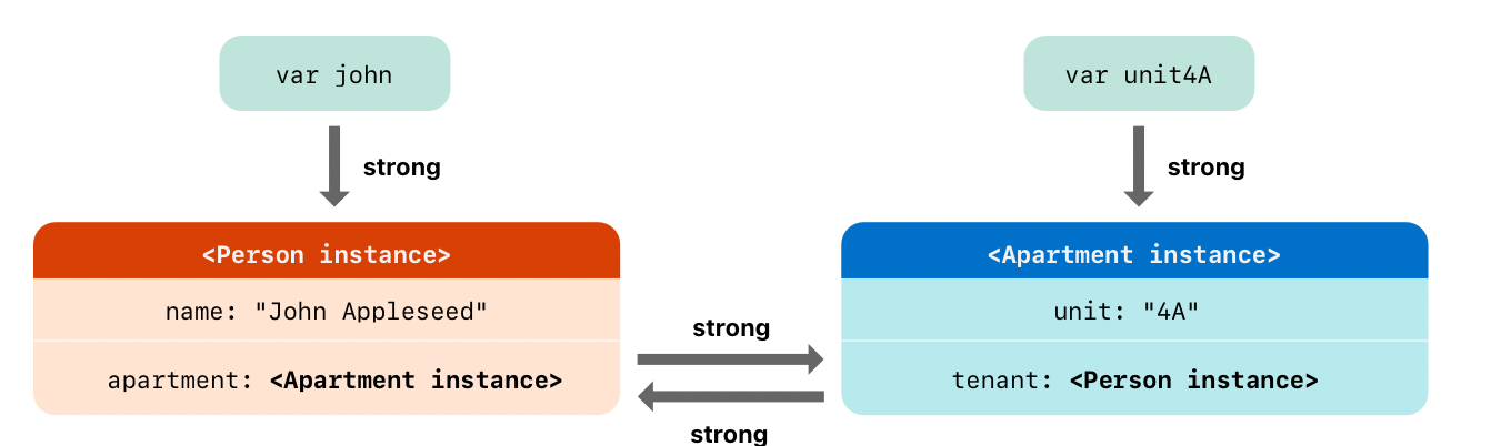 Person과 Apartment 두 개의 클래스가 있고, 각각의 내부 프로퍼티로 서로를 가질 수 있도록 코드가 작성되어 있다. 우선 john과 unit4A라는 변수에 Person과 Apartment 인스턴스를 각각 할당하고, john과 unit4A의 프로퍼티에 각각 unit4A와 john을 할당해 주었다.
