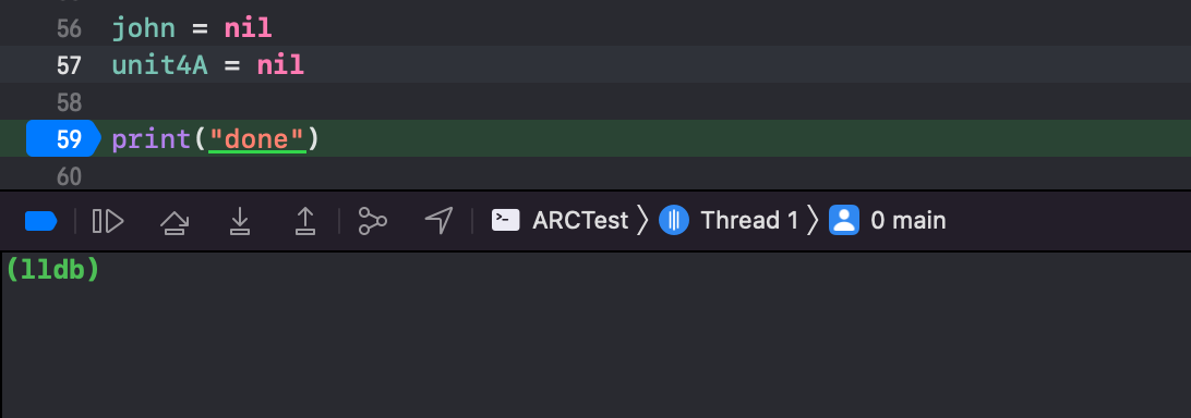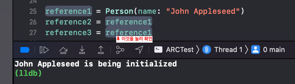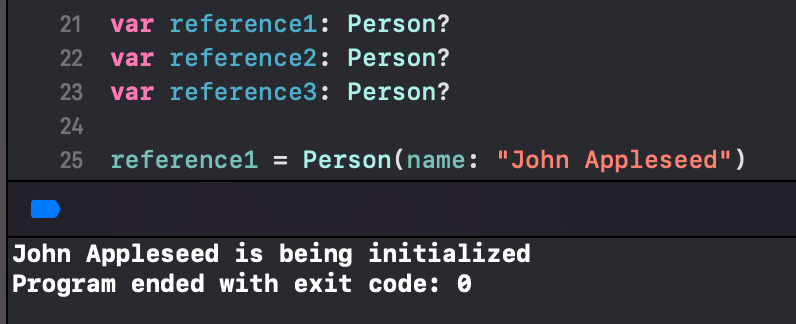 각각의 변수가 nil이 될 때마다 own references가 1씩 감소하고, 마지막으로 reference3이 nil이 되면서 Person 인스턴스가 메모리에서 해제되는 것을 확인할 수 있다. (deinit 프린트)