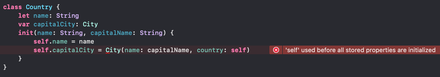 City를 생성할 때 self를 넘겨주고 있는데, 아직 인스턴스의 값이 모두 초기화되지 않았다는 에러가 난다. 이 부분은 Two phase init의 조건을 만족하지 못해 생겨난다. (관련 글은 여기)