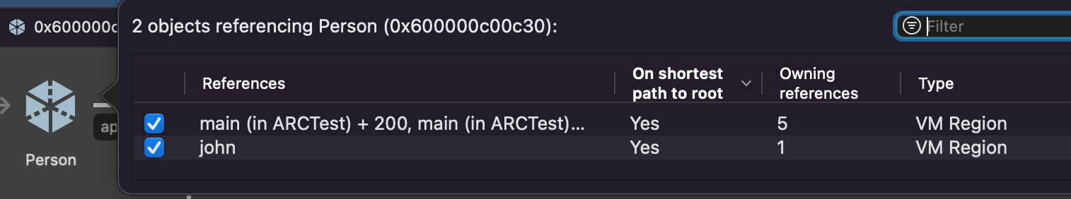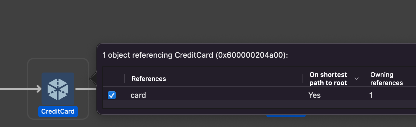 Customer 인스턴스를 참조하는 친구들에 john과 customer가 보인다. 그런데 customer는 "unowned"라서 Owning references에 0으로 찍힌다! 고로 Customer 인스턴스의 reference count는 1.