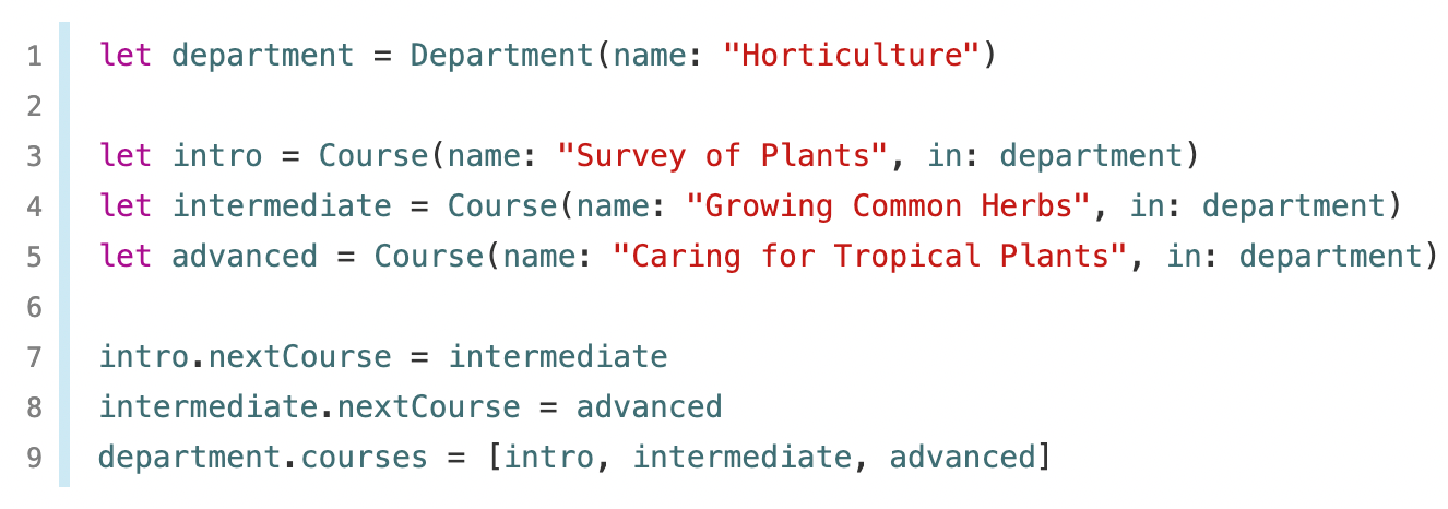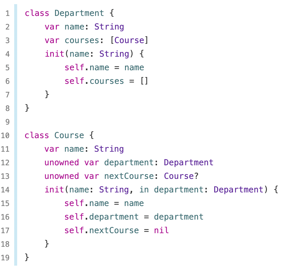 각각의 Course 인스턴스들은 Department 인스턴스와 다음 Course 인스턴스를 unowned 참조하고, Department 인스턴스에서는 Course 인스턴스들을 강하게 참조한다.