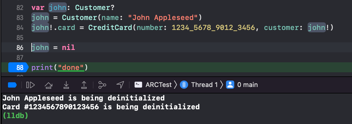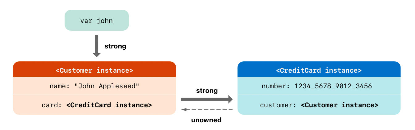 john은 Customer 인스턴스를 strong 하게 참조하고, john의 card는 CreditCard 인스턴스를 참조하는데, CreditCard 인스턴스는 customer 프로퍼티가 Customer 인스턴스를 unowned로 참조한다.