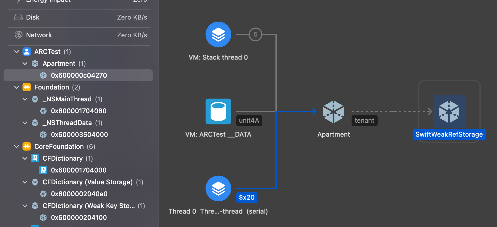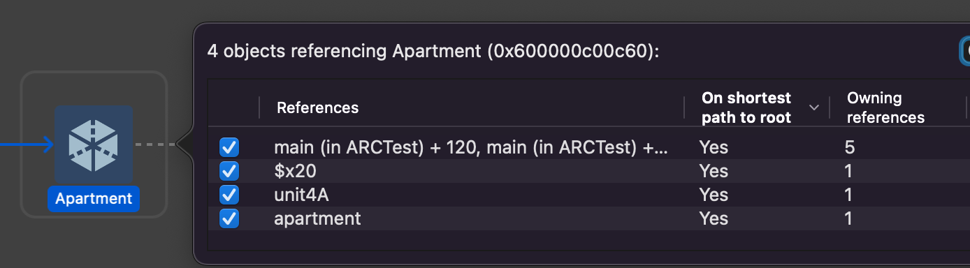 그리고 Apartment 인스턴스를 참조하는 것은 unit4A와 Person의 apartment 두 개다. (Person의 aprtment는 strong)