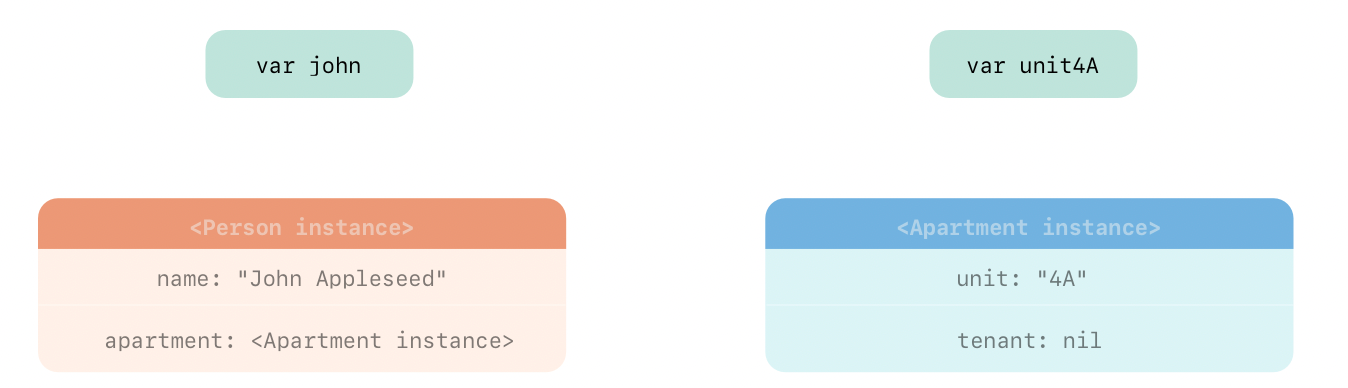 john과 unit4A에 각각 Person과 Apartment instance가 할당되었고, 각 인스턴스 내부를 보면 Person의 apartment 프로퍼티는 Apartment 인스턴스를 strong 하게 참조하며 Apartment 인스턴스의 tenant 프로퍼티는 Person 인스턴스를 weak으로 참조한다.