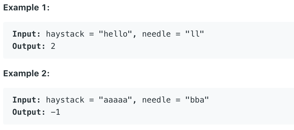 28번 문제는 strStr 구현하기. 주어진 hayStack 문자열과 subString이 될 niddle 문자열을 받아 hayStack에 niddle이 있는 경우 첫번째 인덱스를, 없는 경우 -1을 반환하는 문제.
