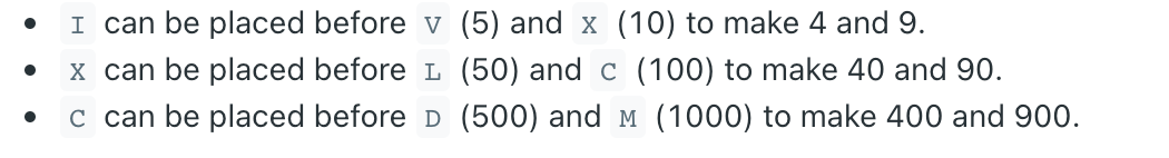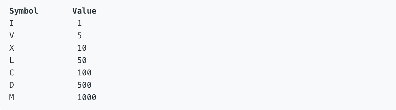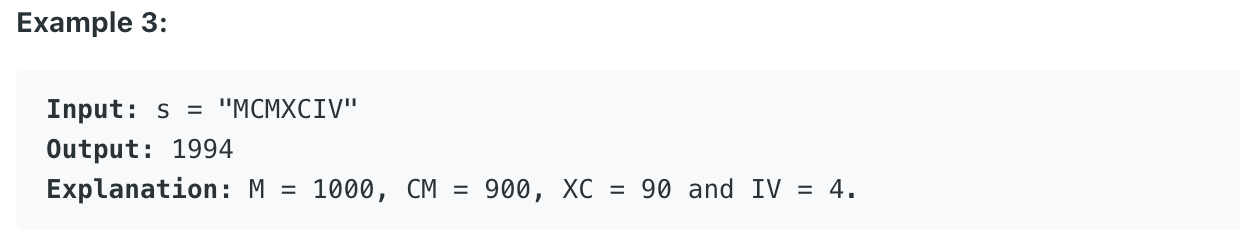 Input으로 MCMXCIV라는 문자열이 들어왔을 때 M은 1000, CM은 900, XC는 90, IV는 4로 치환되어 결과값이 1994가 된다.