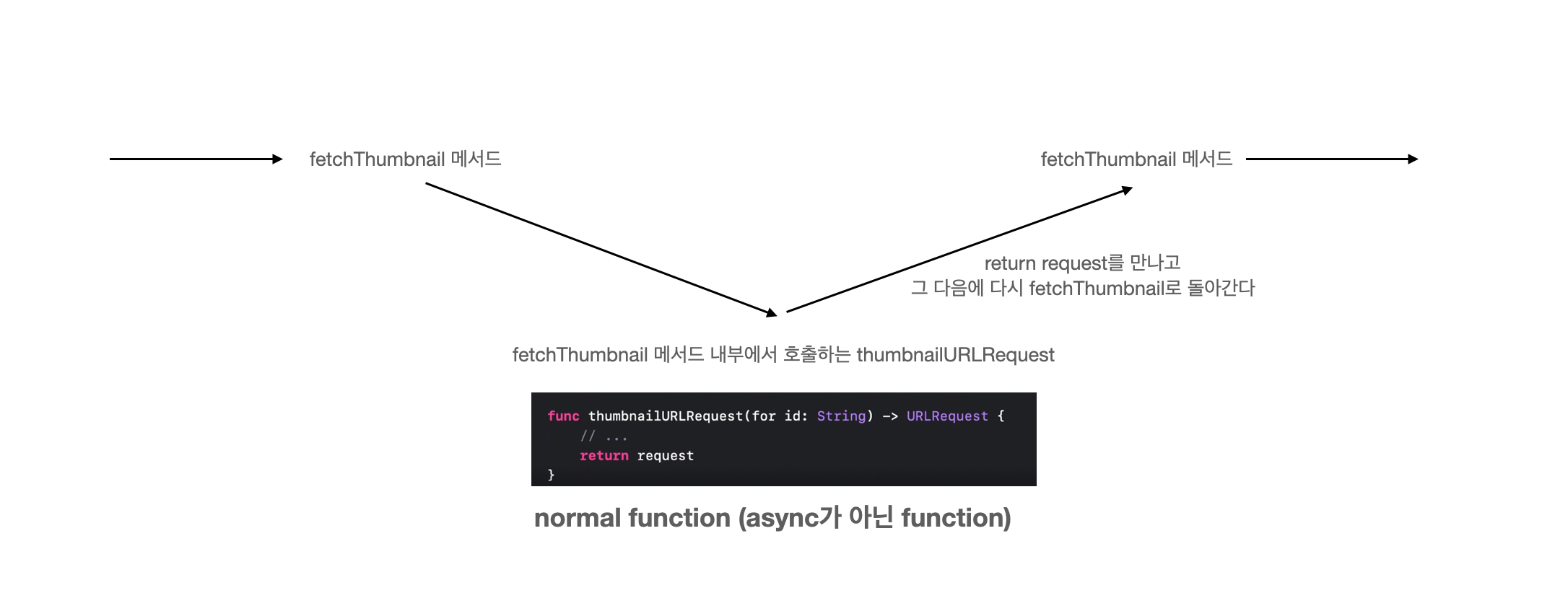 여기서는 fetchThumbnail 메서드가 thread를 점유하고 있다가 thumbnailURLRequest 메서드 호출이 됐을 때 thread는 thumbnailURLRequest 메서드를 수행한다. 여기서 return request가 되어야만 thread는 다시 fetchThumbnail 메서드의 작업을 실행한다.