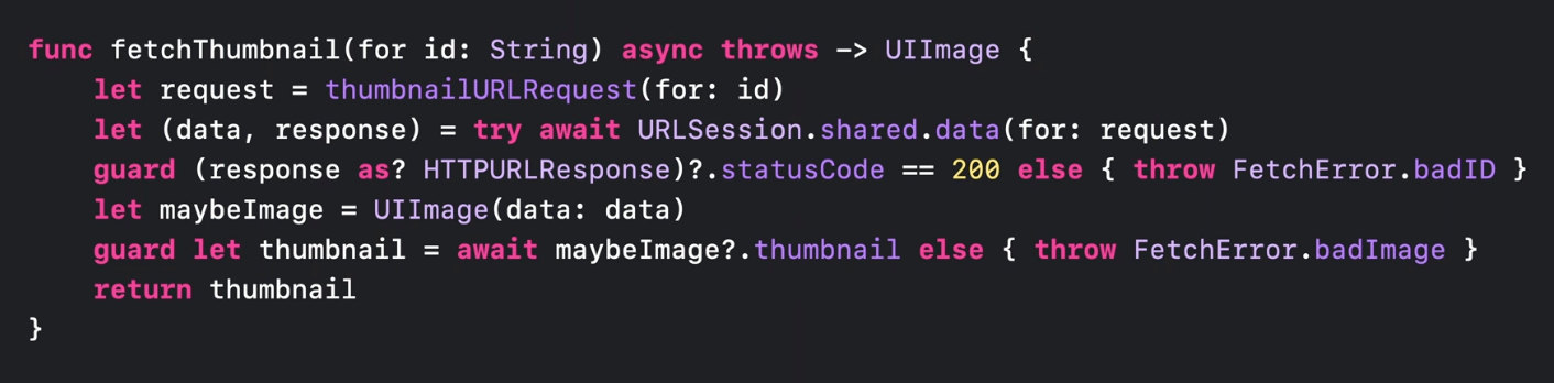 - 함수 선언부에 async throws는 fetchThumbnail 메서드가 async 하게 동작할 것이며 성공한 경우에는 UIImage를 작업에 문제가 생기는 경우 에러를 throw 하겠다는 의미이다.