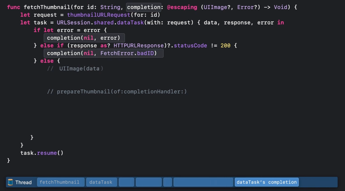 dataTask의 completion 내부에서 또다시 prepareThumbnail을 실행하고, completion으로 thumbnail을 받아 completion으로 던져준다.