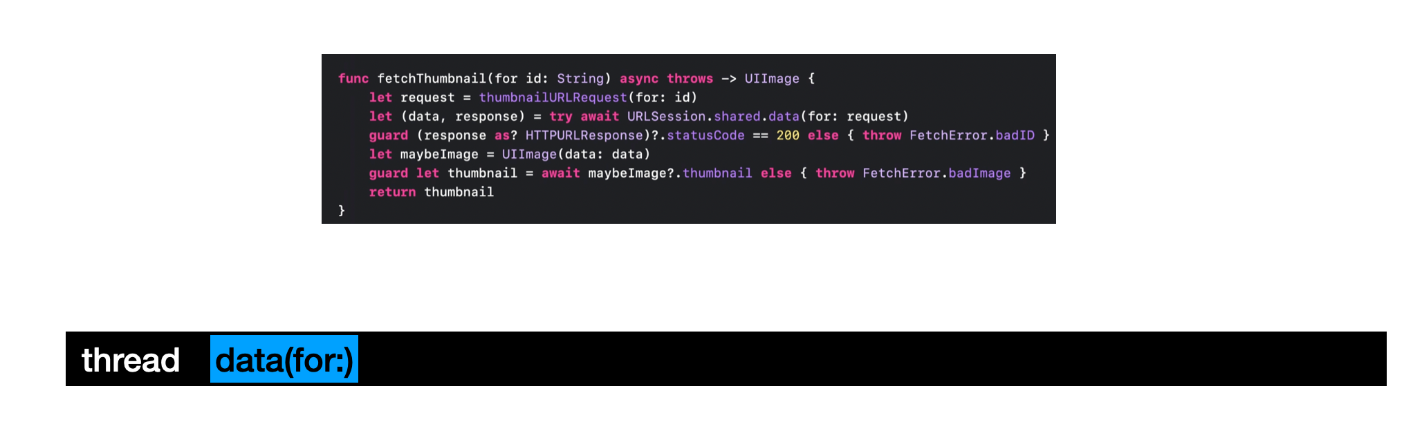 suspend가 된다는 것은 현재 점유하고 있던 thread의 제어권을 system에 다시 반환하는 것. 그렇게 되면 data 메서드는 잠시 suspend 되고, system이 판단하기에 더 중요한 작업을 우선 처리하다가 '아 이제 저거 빨리 다시 시작해야겠다!' 하면 thread를 data(for:) 메서드를 실행하도록 넘겨준다(resume). resume이 되어 다시 돌아왔을 때 fetchThumbnail의 기타 남은 작업을 모두 처리(throw 에러를 하거나 UIImage를 반환)하면 thread 사용이 끝나게 된다. (async와 await이라도 반드시 suspend 되는 건 아니라고 하는 걸 보면 system이 상황에 맞게 잘 조율해서 처리하는 듯 보인다.)