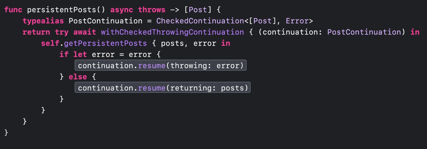 withCheckedThrowingContinuation을 사용해 completion이 아닌 [Post]를 반환하도록 메서드를 수정할 수 있다. 단, 주의해야 할 점은 다시 실행 되어야 하는 부분에서 resume 코드를 꼭 추가해주어야 한다는것! 그렇지 않으면 [Post] 또는 에러를 반환할 수 없어진다. 또한 하나의 경우에 두 번의 resume을 호출 할 수 없고, if-else가 있다면 양쪽의 경우 모두 resume을 추가해주어야 정상 동작한다.
