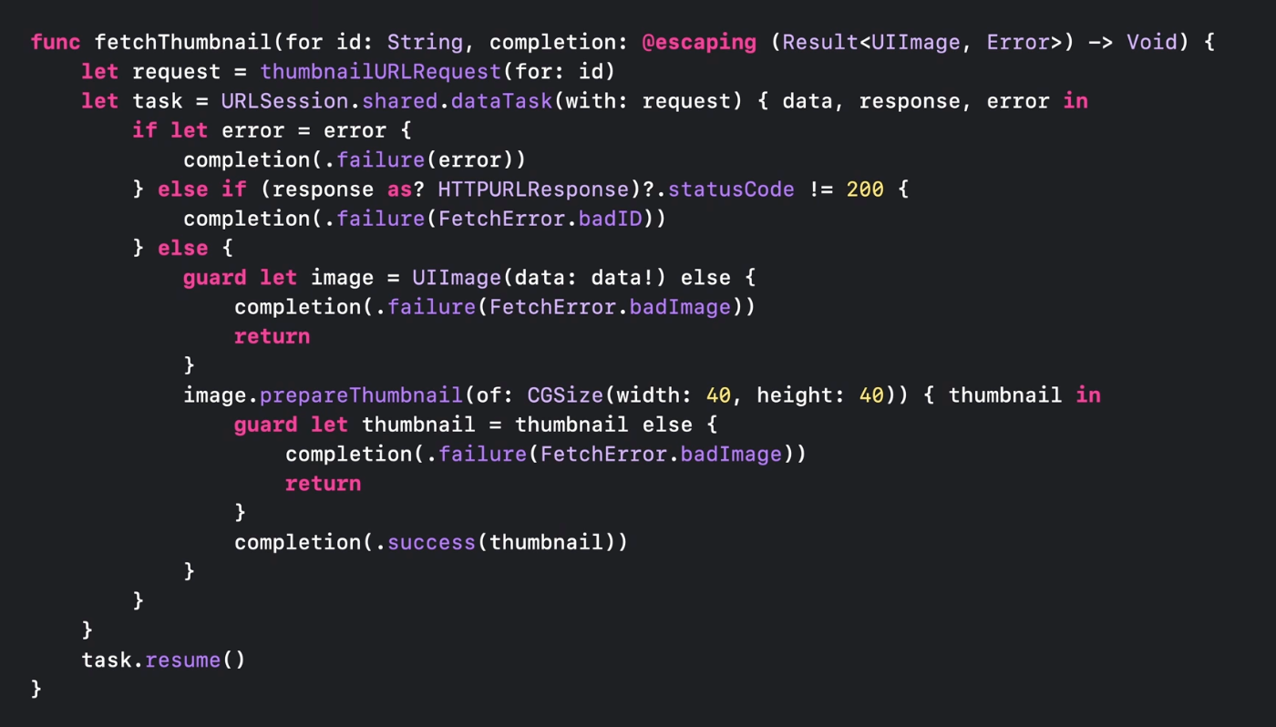 completion을 호출해주지 않으면 fetchThumbnail은 결괏값으로 뭐가 들어왔었는지도 모른 채 종결되고 만다. (당연히 thumbnail 업데이트도 없겠지?) Swift에서는 에러를 throw 하는 completion을 강제하지 않아서 빌드하고 실행해도 전혀 문제가 없다. 따라서 completion을 개발자가 적절히, 깜빡하지 않고 제때 잘 적어줘야 한다. 이 코드에서는 빼먹은 return 앞 completion들을 포함해 총 5개의 completion이 필요했지만, 코드가 길어질수록 셀프 체크해야 하는 부분은 늘어난다.