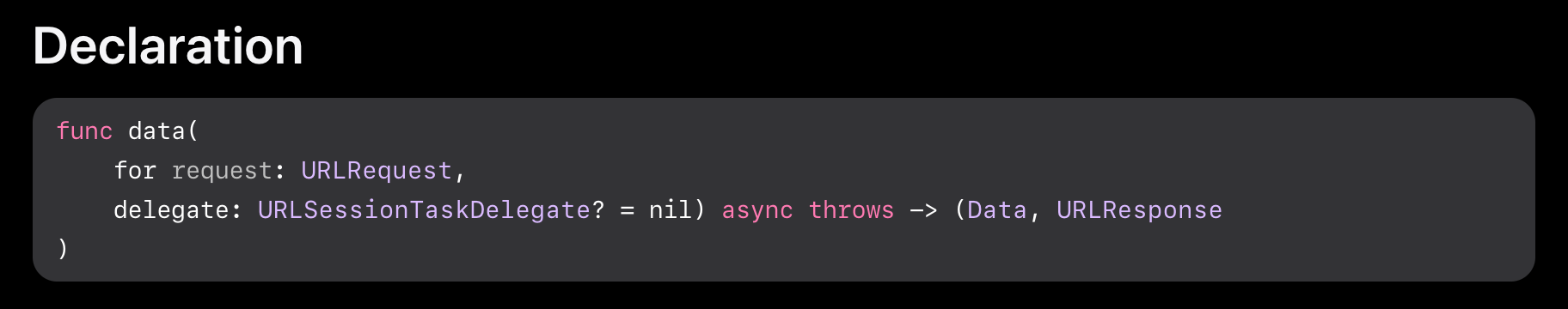 - try await는 URLSession.data(for:delegate:) 메서드의 선언을 확인해보아야 한다. 아래 캡처한 이미지처럼 data 메서드는 에러를 throw 하기 때문에 try가 필요하다. 또한 async 하게 동작하기 때문에 async 메서드의 동작 완료를 기다린다는 표시인 await 키워드를 사용한다.