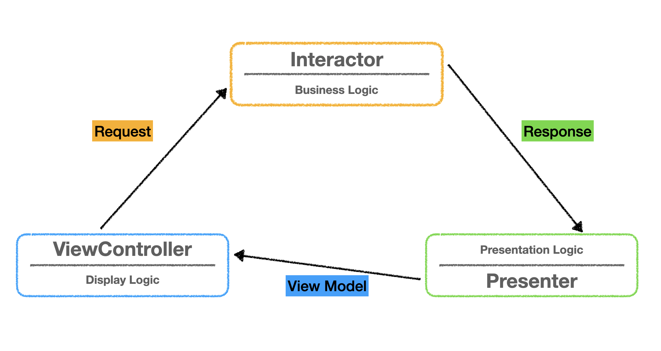 위의 그림처럼 ViewController는 Interactor에 있는 비즈니스 로직 호출을 할 때 Request에 필요한 데이터를 담아 넘겨준다. Interactor에서는 필요한 로직을 처리한 뒤에 그 결과값을 Response에 담아 Presenter에 넘겨준다. 마지막으로 Presenter는 ViewController가 화면에 정상적으로 값을 표현할 수 있도록 Response의 데이터를 가공해 ViewModel에 담아 ViewController로 넘겨주면 ViewController에서 화면 갱신이 일어나게 된다.