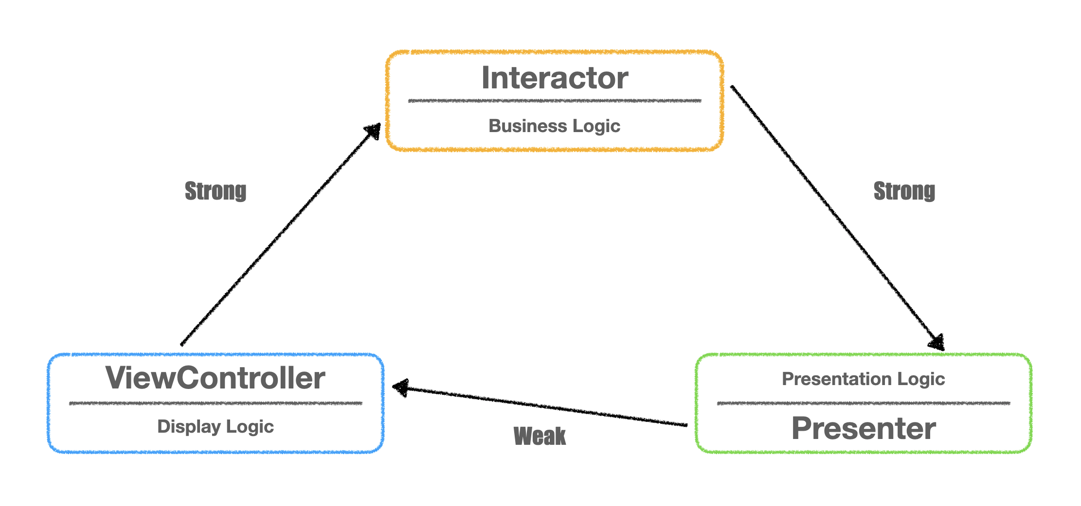 로 역할이 구분되며 데이터가 ViewController에서 Interactor, Interactor에서 Presenter, Presenter에서 다시 ViewController로 흐르기 때문에 아래 이미지 처럼 단방향 플로우가 된다. 이때 VIP는 각각의 다음 Component를 참조하는데 모든 곳이 Strong으로 연결되면 순환참조가 일어나기 때문에 Presenter에서는 ViewController를 Weak으로 가진다.