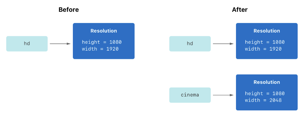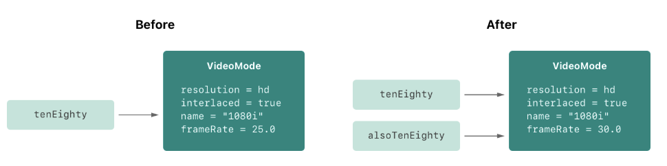 VideoMode가 클래스일 때 tenEighty = alsoTenEight 코드를 만나게 되면 struct와 달리 같은 인스턴스를 가리키고 있는 것을 볼 수 있다.