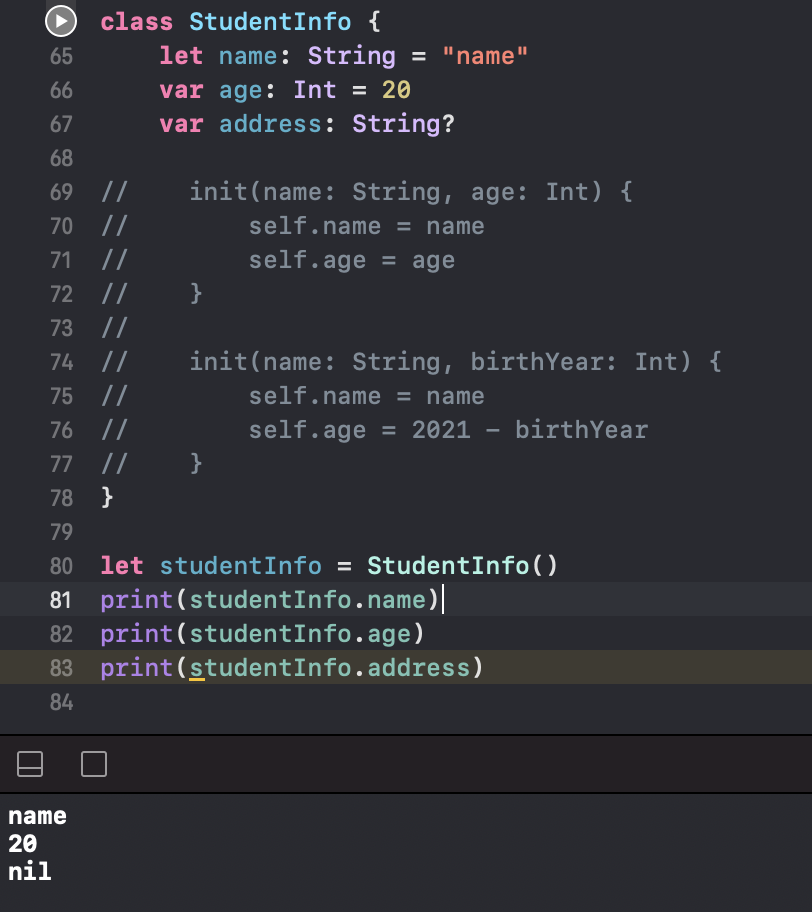 name과 age는 클래스 내부에서 설정한 기본값으로, 옵셔널로 지정된 address는 nil이 반환되는 것을 확인할 수 있다.