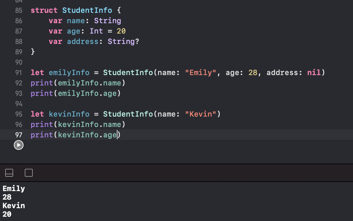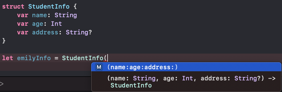 name, age, address의 기본값을 정해주지 않았지만 Memberwise Initializer를 사용해서 초기화 할 수 있다!! 정말 좋은 기능이다..