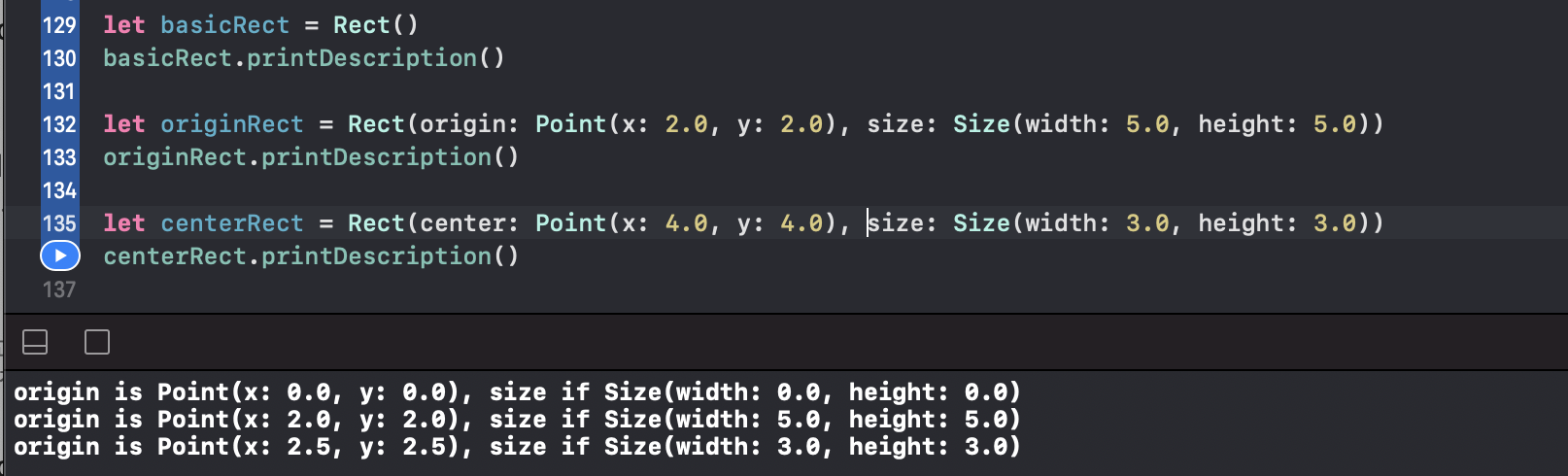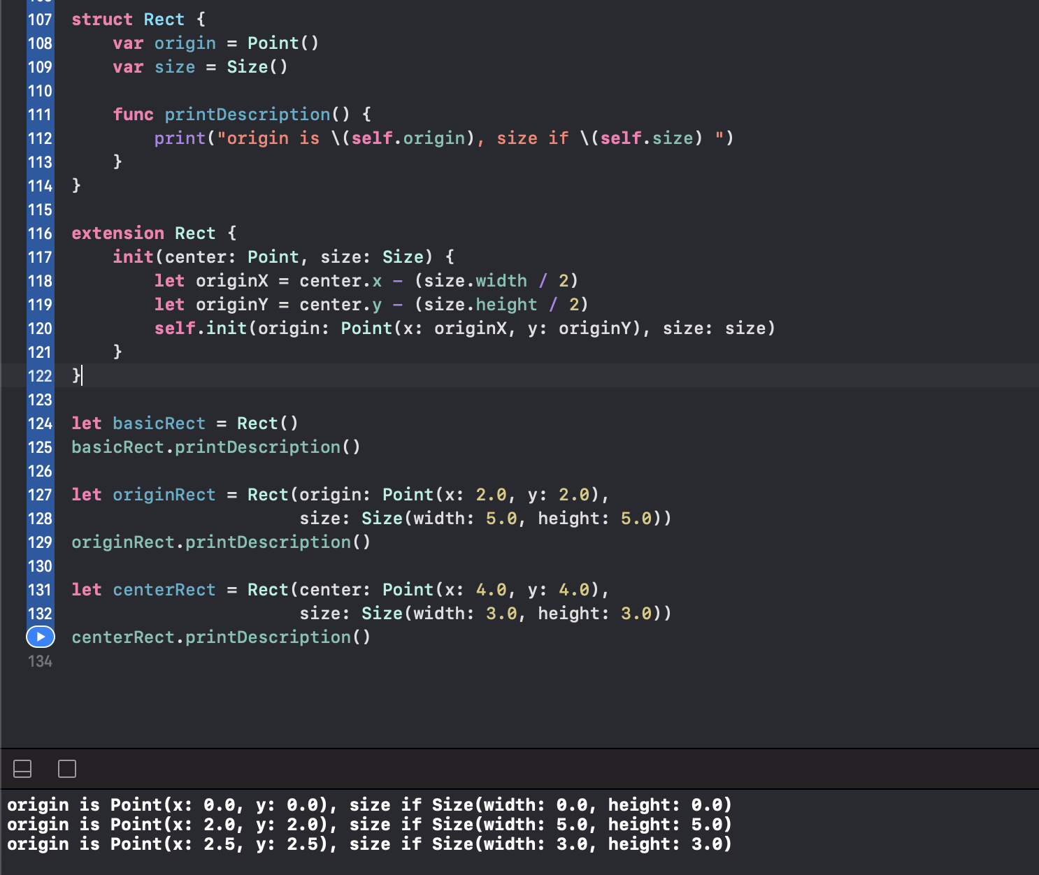 - center를 받아서 계산을 거친 뒤에 Rect의 init(origin: size:) 메서드를 호출해준다. 이것이 바로 Initializer Delegation이다!