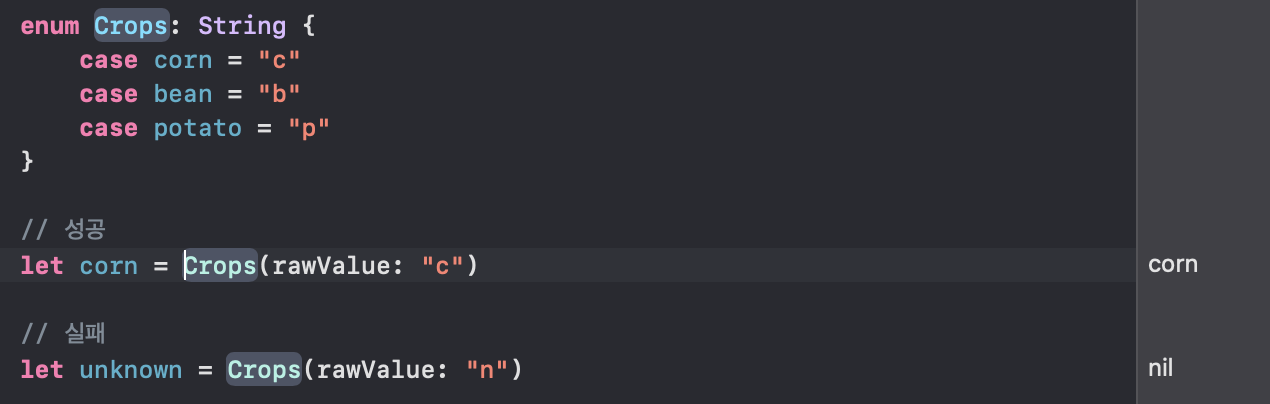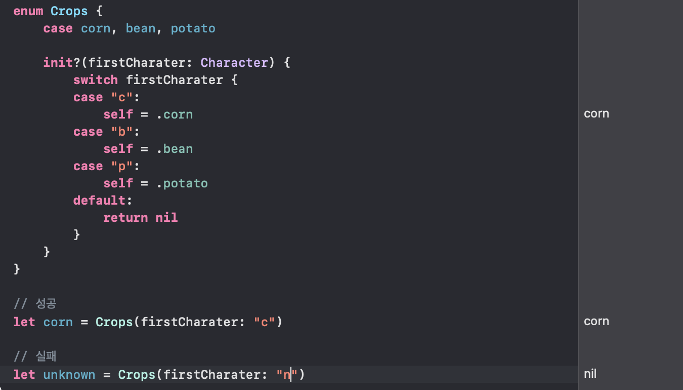 하지만 위에 적어둔 예는 각 작물의 firstCharacter를 rawValue로 지정한 뒤에 사용하면 init?을 직접 구현하지 않아도 된다.