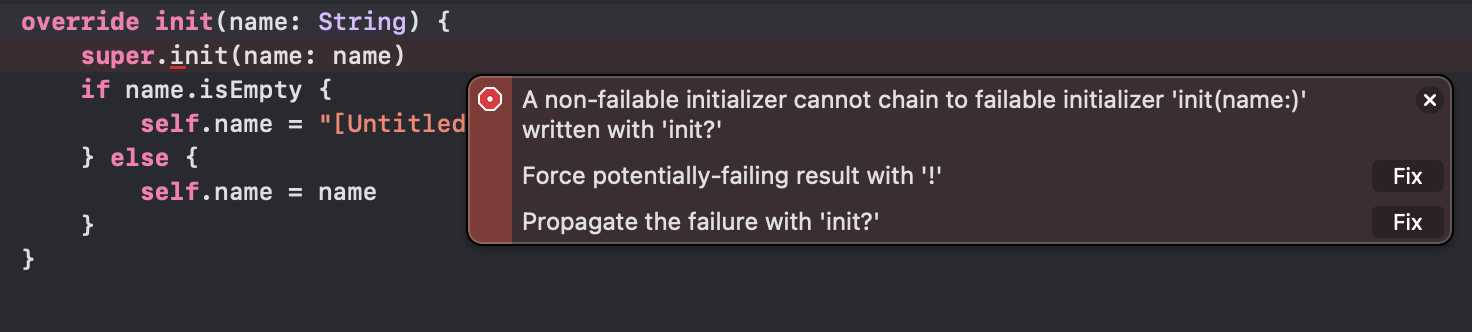 init은 무조건 초기화가 성공해야 하는데, super의 failable initializer를 사용하려고 하니 당연히 에러가 난다.(나는 초기화를 무조건 성공시켜야 하는데 failable init을 호출하면 nil로 초기화가 실패할 수도 있으니까!) 이때 컴파일러는 두 가지 선택권을 준다. 하나는 하위 클래스의 init(name)을 failable로 바꾸는 것, 그리고 남은 하나는 다음 절에서 확인할 수 있는 강제 언래핑 초기화 메서드를 사용하는 법이다.