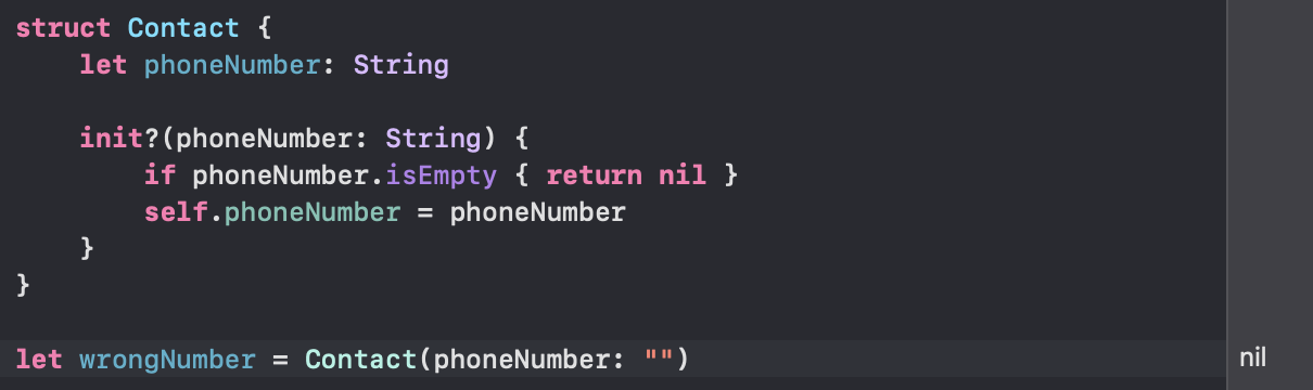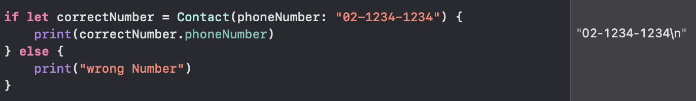 위에 작성한 failable init 메서드를 보면 알 수 있듯이 초기화에 필요한 조건을 만족하지 않는 경우는 nil을 리턴 시키면 된다. 이니셜라이저는 초기화가 정확하게 초기화되도록 하는 역할이기 때문에 성공할 때는 값을 반환하지 않는다. (실패일 때만 nil을 반환하게 된다.)