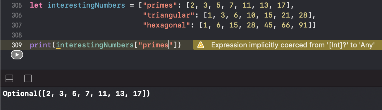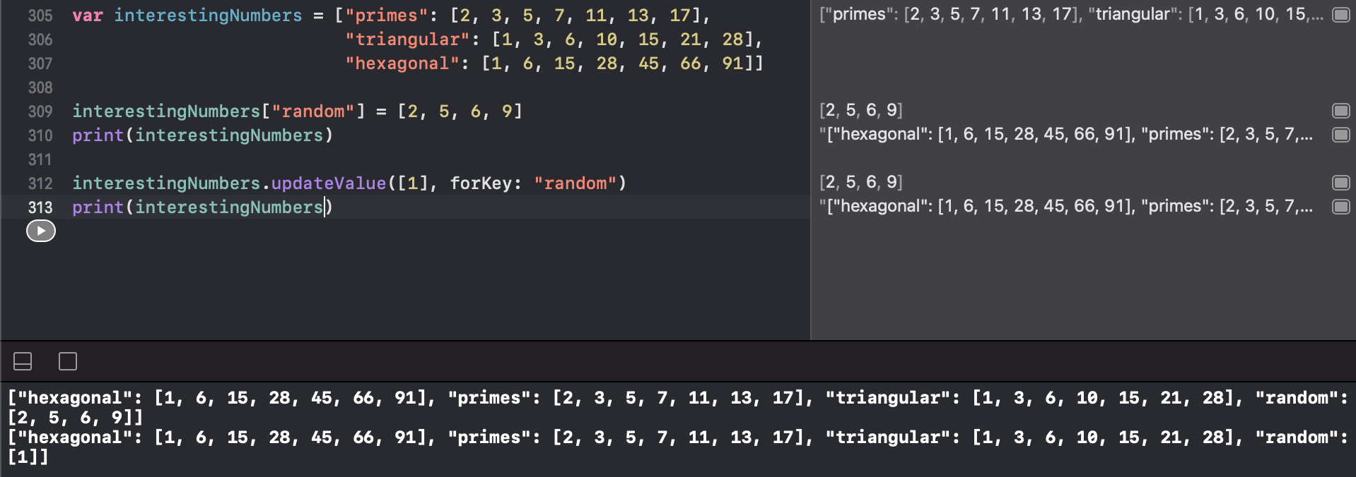결과를 확인하기 위해 강제 언래핑을 사용하기는 했는데, print로 찍어보니 interestingNumbers에서는 제거되고 randomValues에는 key와 value가 저장되었다.