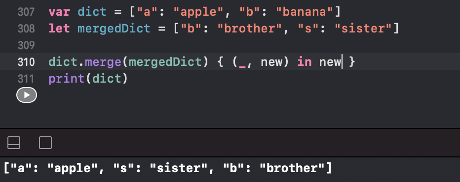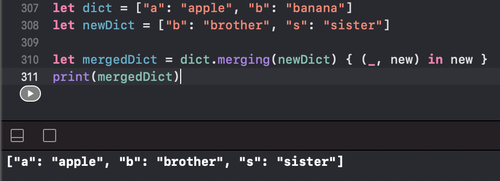 새로 들어오는 값을 남길지, 기존의 값을 남길지 결정하는 건 merge와 동일하다. 대신 새로운 Dictionary가 하나 생성되는 걸 확인할 수 있다. merging을 쓰니까 merge에서 사용하는 것처럼 dict를 var로 변경하지 않아도 되어서 좋다.