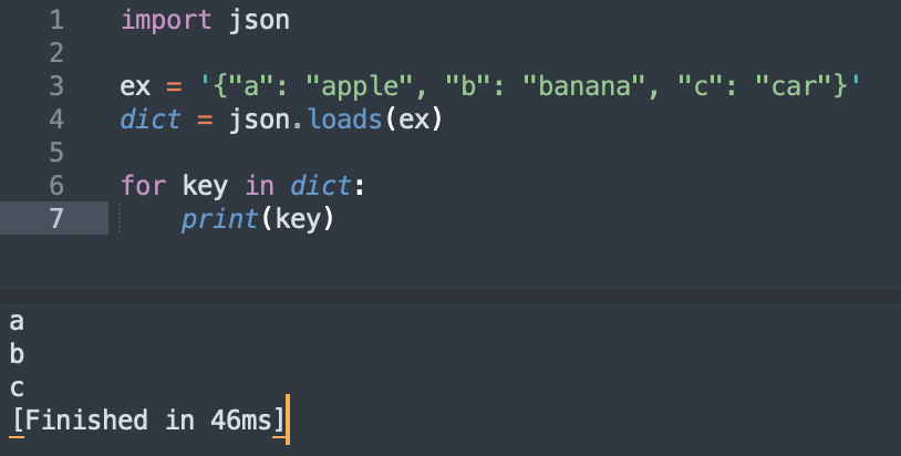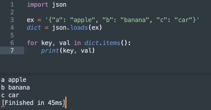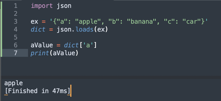 ex = '{"a": "apple", "b": "banana", "c": "car"}'