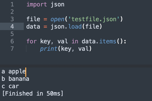 그리고 파일로 저장된 json을 불러와서 dict로 변환도 가능했다. open('파일명')으로 가져왔다. (같은 폴더 내에 있는 json을 사용했다.) loads 아니고 load()로 불러와야 한다.