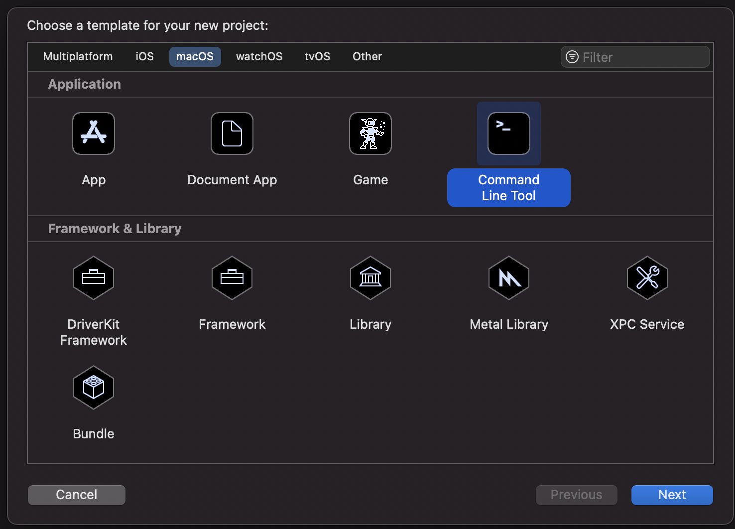 그 후에 macOS - Command Line Tool을 선택해서 프로젝트를 생성한다.