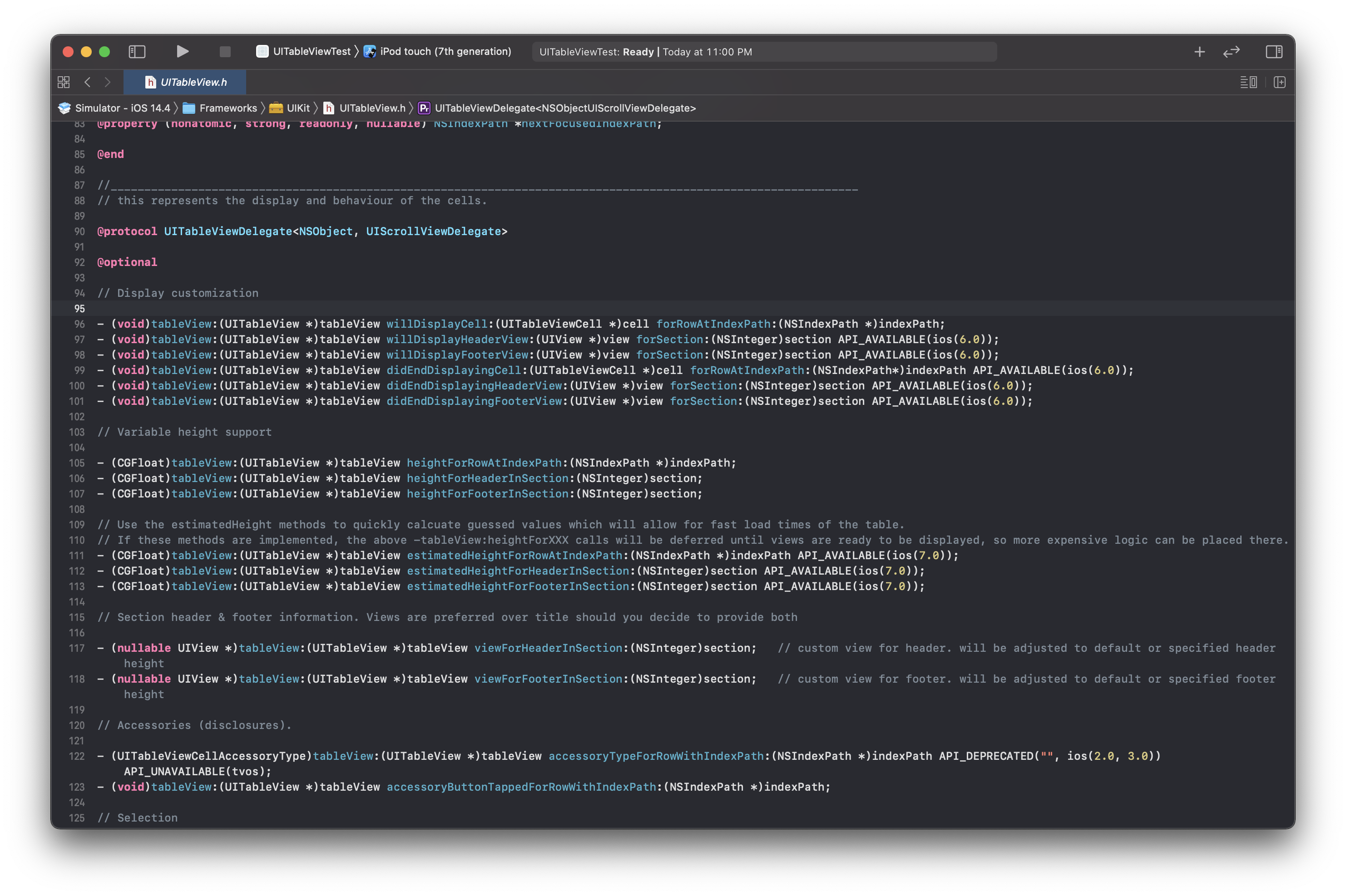 엑스 코드에서 command + shift + o를 눌러 UITableViewDelegate를 검색하면 프로토콜의 정의를 확인할 수 있다.