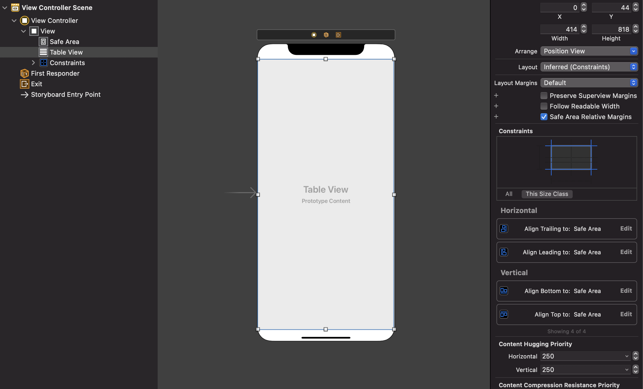 우선 테이블 뷰를 사용하기 위해 UITableView를 ViewController에 하나 넣고, Constraints를 잡아주었다.