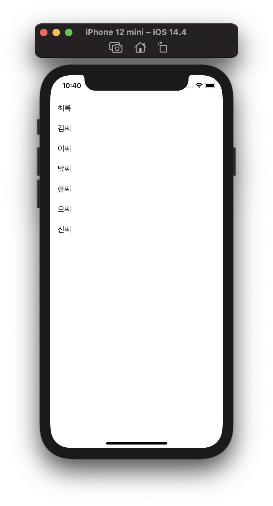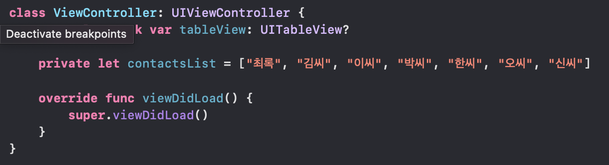 드디어 이름을 표시하는 cell이 하나 나타났다! cellForRowAt에서 직접 데이터를 넣어주었기 때문에 한 줄의 cell이 표기되었다. 만약 여러 사람을 목록에 노출시켜야 한다면 어떻게 해야할까? 우선 여러 이름을 담은 데이터를 배열로 viewController에 저장해보자.