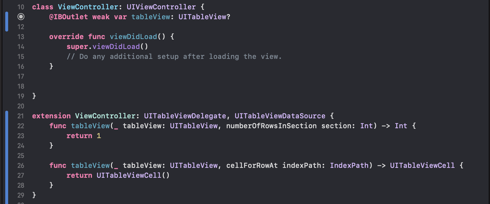 이렇게 연결해준 뒤에는 ViewController 클래스에서 UITableViewDataSource와 UITableViewDelegate 프로토콜을 채택하여 필요한 부분들을 구현해주어야 한다.
