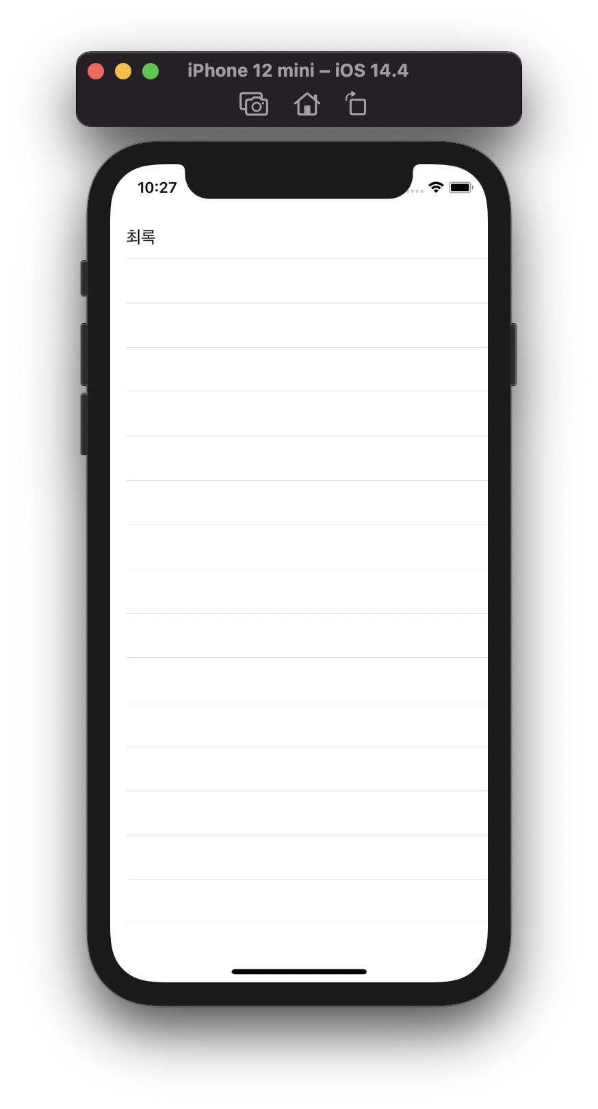 아무것도 없이 줄만 그어져 있다. 왜냐, 우리는 tableView에 노출해야 할 data도 없고, 어떤 방식으로 노출할 건지를 결정하는 UITableViewCell도 그냥 기본으로 넣어 주었기 때문이다. 이제 필요한 작업들을 마무리해서 진짜 tableView에 원하는 데이터를 넣어보자.