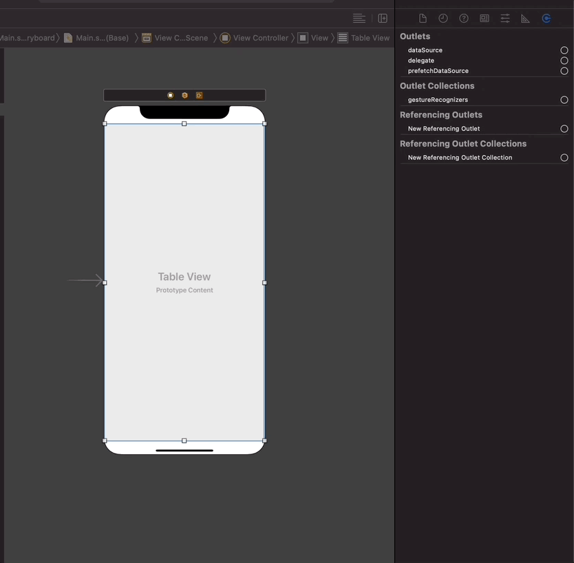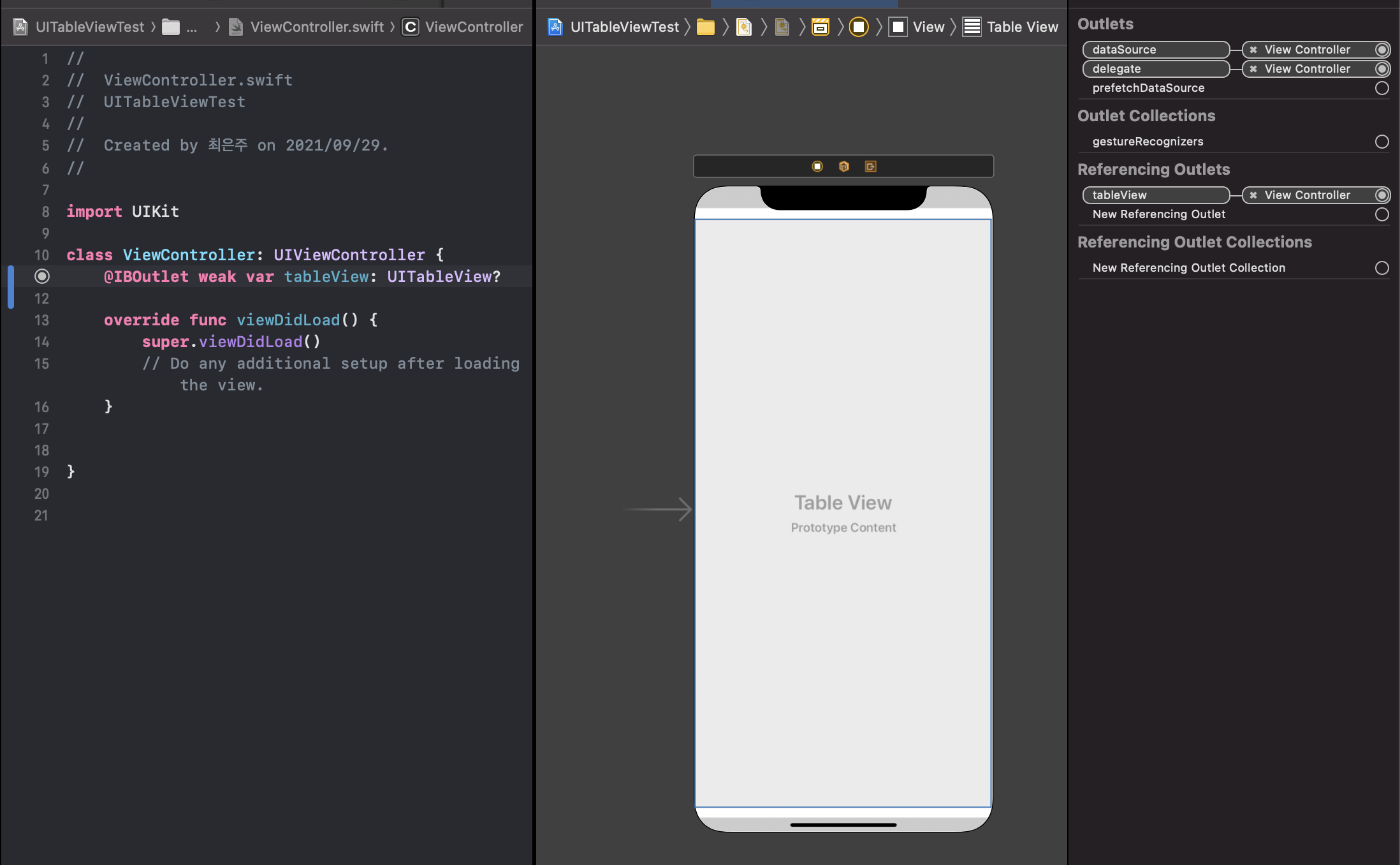 그리고 테이블 뷰의 인스펙터 가장 마지막 탭에 있는 dataSource와 delegate를 viewController에 연결해준다. (ViewController의 코드 내부에서 해줘도 되지만 그냥 이렇게 UITableView 넣었을 때 바로 연결해주는 게 마음이 편하다)