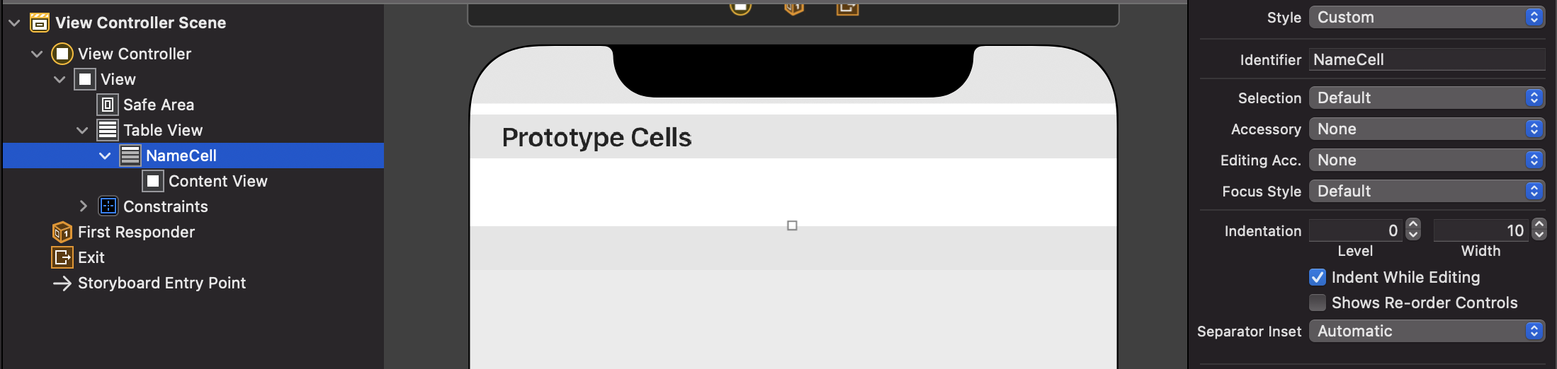 이름을 노출하는 cell이기 때문에 NameCell이라고 명명하고 Identifier도 "NameCell"로 지정해주었다. 그리고 난 다음에 cellForRowAt 메서드 내부에서 dequeueReusableCell로 사용할 cell identifier로 내가 지정한 NameCell을 가져온 뒤에 textLabel에 이름을 적어 넣었다.