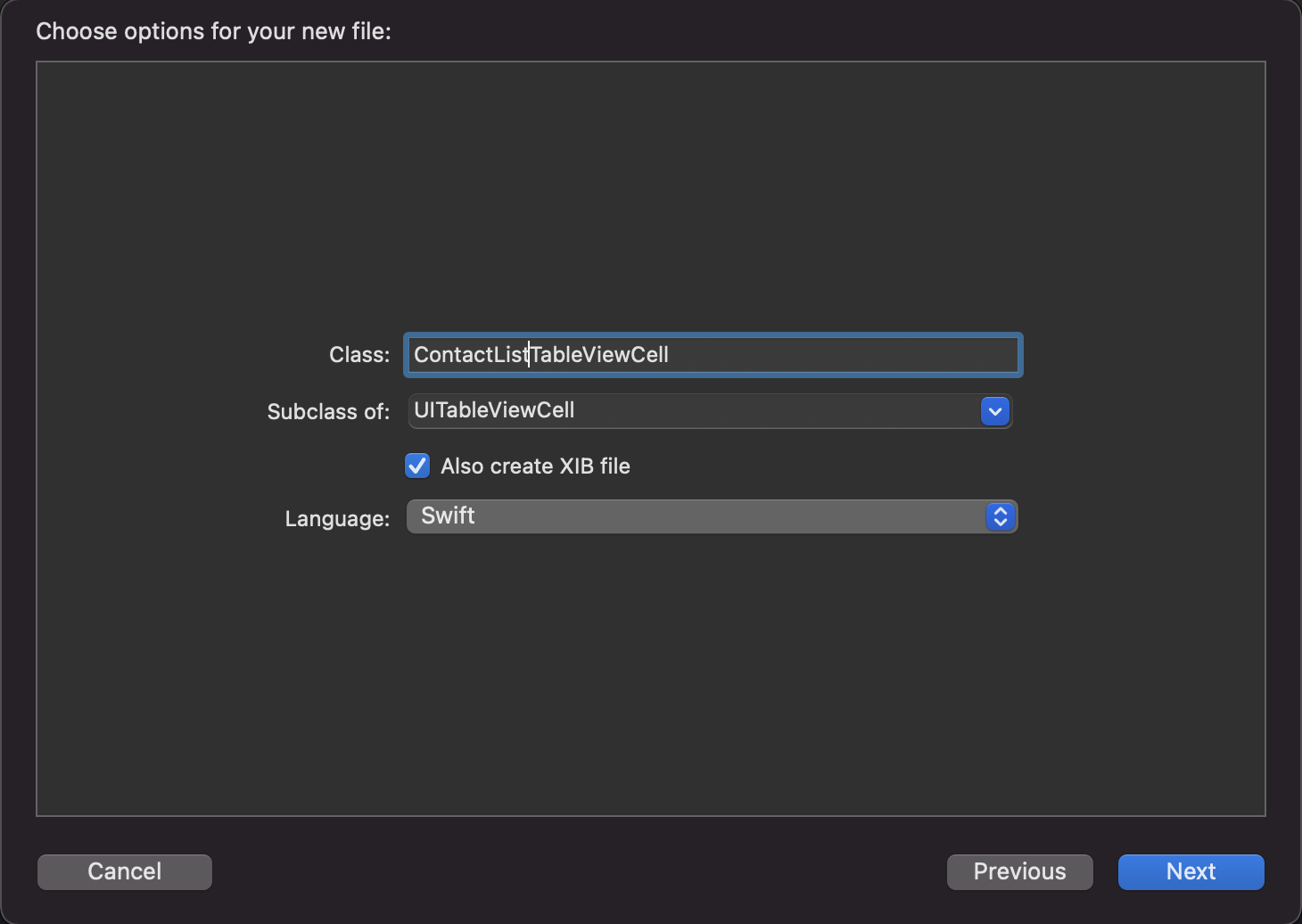 파일 생성 - Cocoa Touch Class를 선택하면 다음 화면에서 xib파일과 함께 클래스를 생성할 수 있다. SubClass에는 꽤 많은 종류가 있지만 이번에는 UITableViewCell을 선택한다.